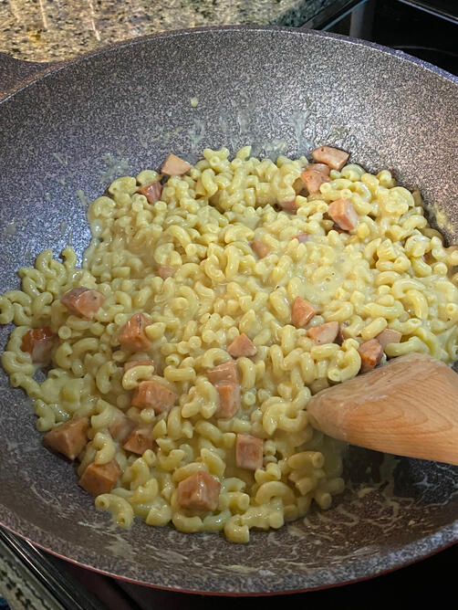 Add the cheddar cheese and garlic powder to the pot and mix. The cheese should melt until the contents are completely mixed. Up to you if you want the cheese to be fully melted or with chunks in it.